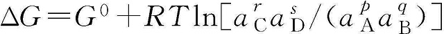 式中,p、q、r和s是化學(xué)物質(zhì)A、B、C和D的化學(xué)計(jì)量系數(shù)。上面方程式的吉布斯自由能變化可用方程式(1-2)表示,其中a是活度。