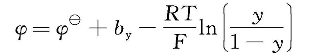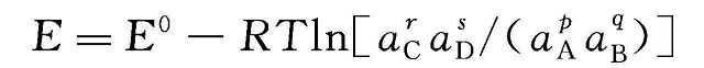 由方程式(1-2)和式(1-10)可導(dǎo)出下面的能斯特方程式,其中電勢差受參與化學(xué)反應(yīng)的組分的濃度的影響。