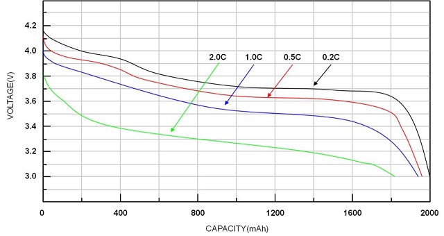 下圖顯示不同放電率下電壓與電池容量的關(guān)系。放電率愈高,電池容量愈低。溫度低時,電池容量也會降低。