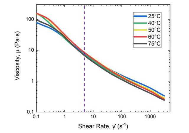 隨著溫度的升高,漿料內部液體分子的無規(guī)則熱運動、聚合物鏈的運動和懸浮顆粒的布朗運動都會增加。研究溫度對NMC532正極漿料流變特性的影響。不同溫度下,漿料應力與剪切速率的曲線如圖4所示。結果表明,在剪切速率約為1.0 s-1的范圍內,所有溫度下流體都表現(xiàn)出剪切應力平臺,從而驗證了在所有溫度范圍內漿液都存在屈服應力(見圖4)。從25℃到60 ℃范圍內,屈服應力隨溫度的升高而增加,但在75℃時屈服應力下降到25℃的水平。