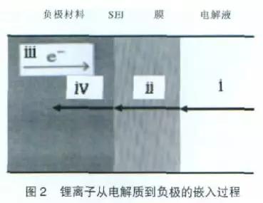鋰離子在負(fù)極嵌入和脫嵌過(guò)程中要經(jīng)歷一個(gè)多步串聯(lián)的過(guò)程(以嵌入負(fù)極為例),如圖2所示,它包括:ⅰ鋰離子在電解質(zhì)中的擴(kuò)散,ⅱ鋰離子在SEI膜中的遷移,ⅲ在膜和負(fù)極材料界面上發(fā)生的電荷轉(zhuǎn)移反應(yīng)過(guò)程,ⅳ鋰離子在負(fù)極材料中的固相擴(kuò)散。