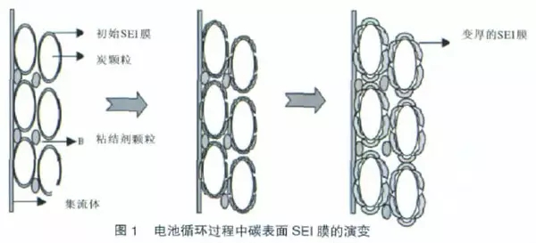 Avery等的研究表明,電極內(nèi)阻隨鋰離子電池充放電過(guò)程的進(jìn)行不斷發(fā)生變化,尤其放電時(shí)內(nèi)阻增加較多,他們認(rèn)為內(nèi)阻的增加是由于負(fù)極表面SEI膜在循環(huán)過(guò)程中脫落產(chǎn)生的一些碎片進(jìn)入電解質(zhì)并在電壓作用下發(fā)生了電泳現(xiàn)象,特別在大電流放電時(shí)這些碎片會(huì)沉積在電極表面使電阻增加,從而影響著鋰離子的脫出。Ning等在研究鋰離子電池的高倍率充放性能時(shí),也發(fā)現(xiàn)電池內(nèi)阻在充放電過(guò)程中增加很多,并認(rèn)為內(nèi)阻的增加主要來(lái)源于負(fù)極,而負(fù)極電阻的增加又是由于SEI 膜的變厚引起的,他們還模擬了負(fù)極在高倍率下SEI 膜變厚的過(guò)程,如圖1 所示。