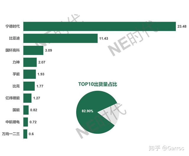 圖為2018年鋰電池出貨量排名。由此可見,寧德時代和比亞迪遙遙領(lǐng)先,郭萱高科技、李紳和富能的其他出貨量均低于10千兆瓦時。
