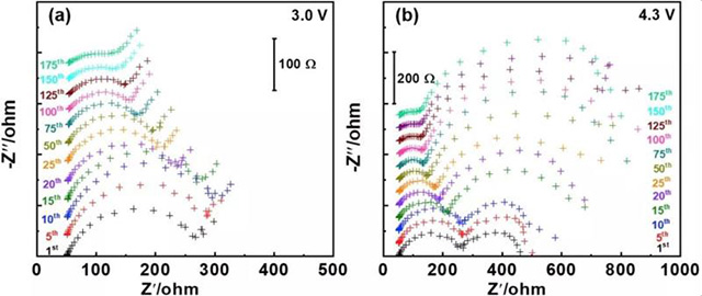 圖5.獲得的Li/SI10-05-70%PC/ NCM811全電池的EIS數(shù)據(jù)的奈奎斯特圖,在a)放電狀態(tài)(3.0 V)和b)充電的情況下,在1C和20℃循環(huán)了180個循環(huán)。
