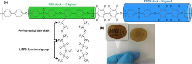 圖1:a)SI10-05離聚物的分子結(jié)構(gòu),親電性PES嵌段以綠色突出顯示,而親電性FPES嵌段以藍色突出顯示。b)在兩個聚酯薄膜之間壓制后,SI10-05-70%PC離聚物膜的照片。